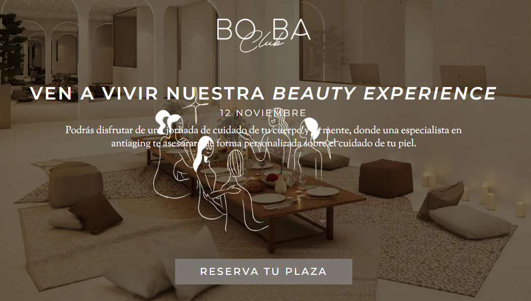 12 de Noviembre – Beauty Experience Beauty Experience con Skin Advisor Bo Ba VEN A VIVIR NUESTRA BEAUTY EXPERIENCE 12 DE NOVIEMBRE Podrás disfrutar de una DETALLES